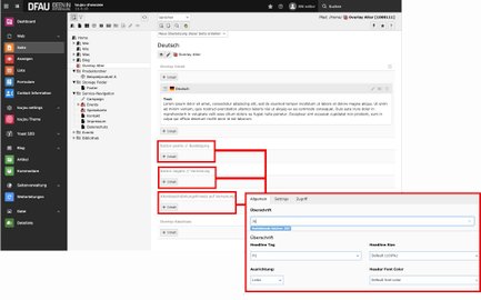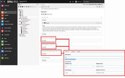 - Zur Gestaltung der Seite stehen Ihnen für Text-Inhalte ein Overlay Content-Bereich oben sowie ein Overlay-Abschluss-Bereich unten zur Verfügung.