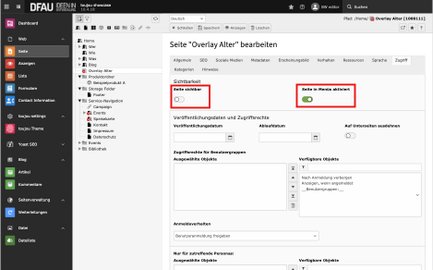 - Per Default sind im Aufbau befindliche Seiten ausgeblendet. Aktivieren Sie den Schalter im Bereich Seite sichtbar, indem Sie auf den Regler drücken, sodass er grün erscheint, um die Seite im Frontend sichtbar zu machen und damit die Funktionalität der Overlay-Einblendung zu gewährleisten.