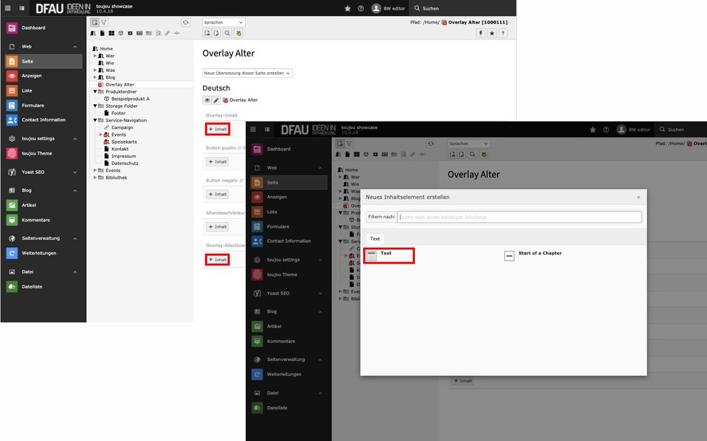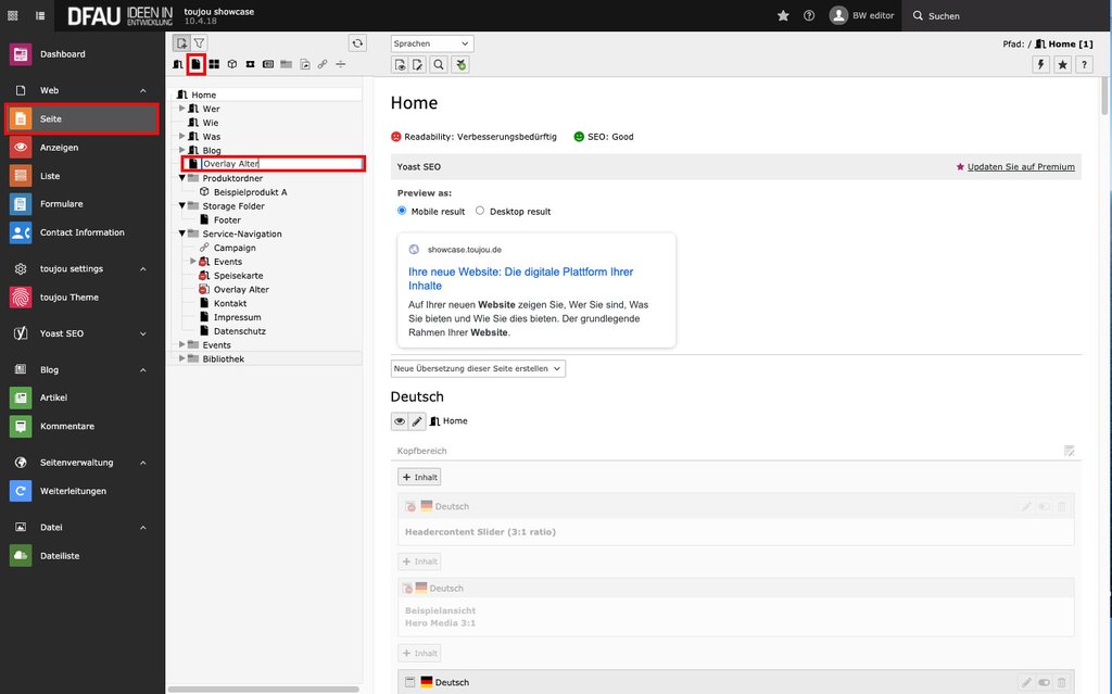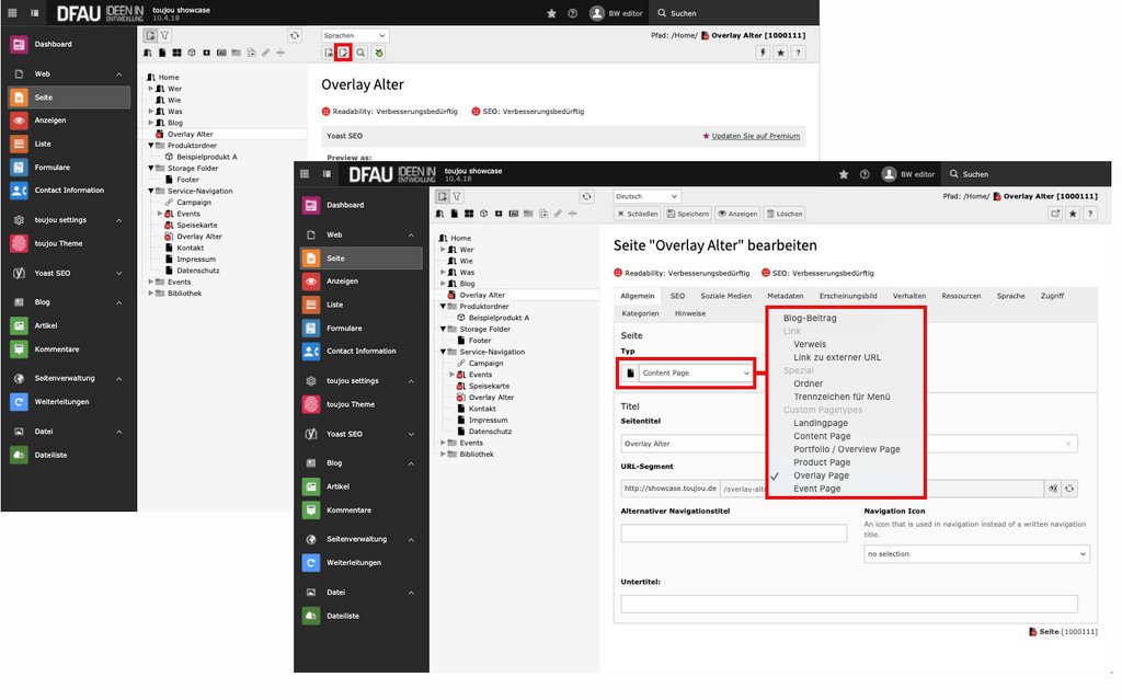 Um Overlay-Seiten in toujou nutzen zu können, müssen zunächst eigens eingerichtete Seitentypen mit Content bestückt werden. Das hier folgende Tutorial hilft Ihnen bei der manuellen Einrichtung einer oder mehrerer Overlay-Seiten.