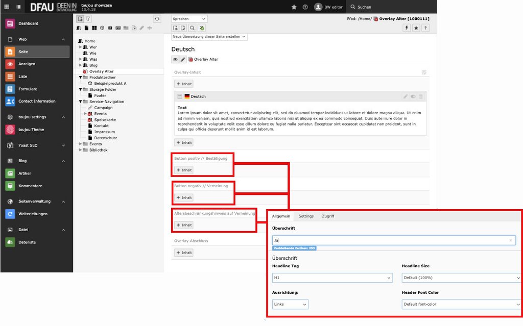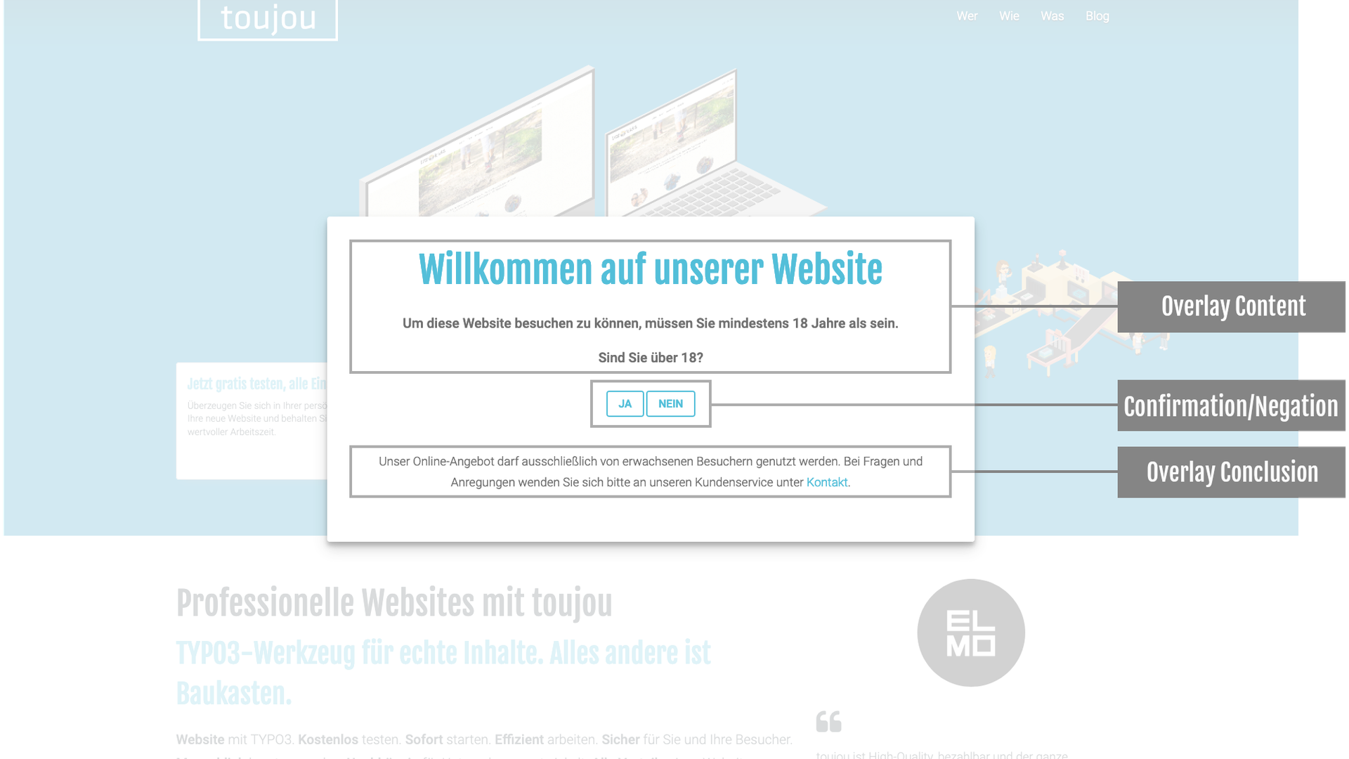 - Im Screenshot sehen Sie beispielhaft einen Inhalt (»Ja«) für den Fall, dass Sie für Ihr Website-Angebot eine Altersbeschränkung anzeigen müssen. Voraussetzung für die gezeigten Inhalte ist eine Frage zum Alter Ihrer Besucher, die Sie im Overlay Content einbauen müssen (siehe Frontend-Screenshot). Für die Verneinung und die Altersabfrage stehen gesonderte Inhaltsfelder zur Verfügung.