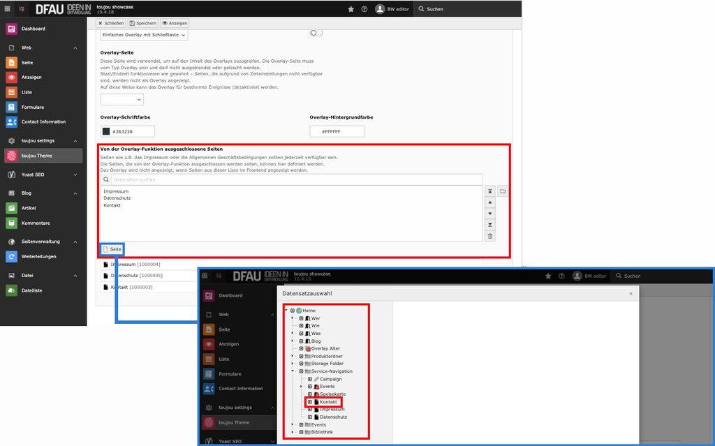 - Sie können diesem Ausschluss weitere Unterseiten hinzufügen. Dazu klicken Sie auf den Button Seite. Es öffnet sich die Datensatzauswahl, in der Sie Ihren Seitenbaum angezeigt bekommen. Klicken Sie auf die entsprechende Seite, die Sie von der Overlay-Funktion ausschließen möchten. In unserem Beispiel: Kontakt.