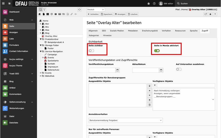 - Per Default werden neue Seiten in Ihrer Navigation angezeigt. Im Falle der Overlay-Seite – diese soll schließlich nicht im Menü angezeigt werden – deaktivieren Sie die Sichtbarkeit im Bereich Seite in Menüs aktiviert mittels Drücken des Reglers.