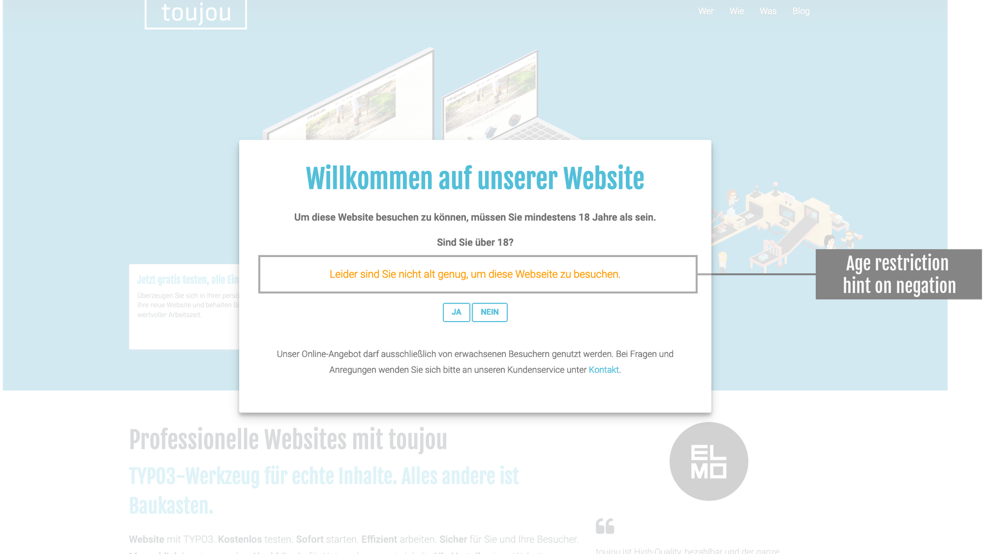 - Altersbeschränkung auf Verneinung: »Leider sind Sie nicht alt genug, um diese Website zu besuchen.«