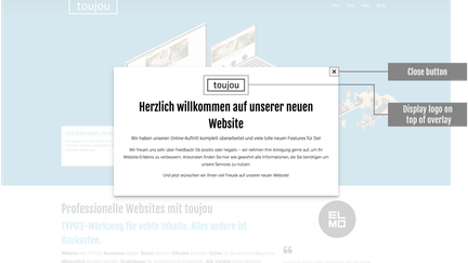- In dieser Beispielansicht sehen Sie einen simplen Overlay-Content zur Begrüßung auf einer neuen Website.