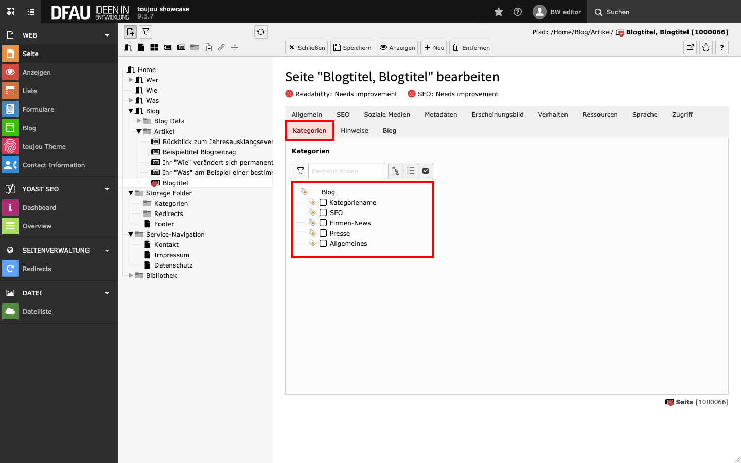 Hier vergeben Sie die zutreffenden Blog-Kategorien, die der Zuordnung und Filterung automatisierter Blog-Elemente dient.