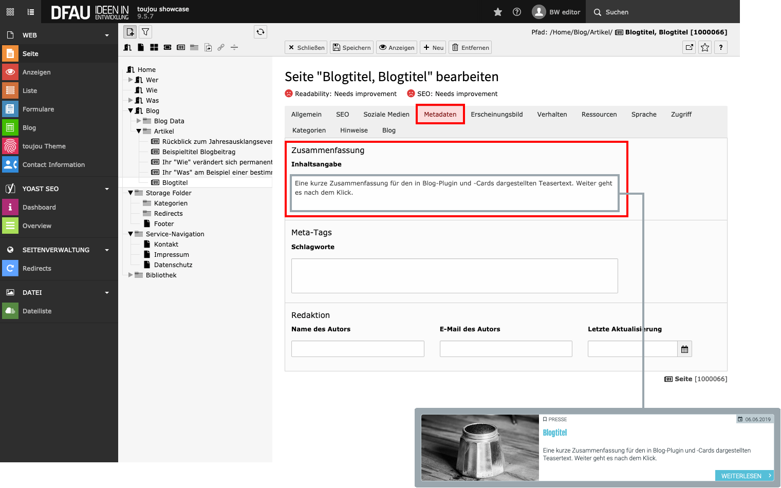 Fügen Sie in die Maske Inhaltsangabe eine kurze Zusammenfassung ein. Diese Inhaltsangabe stellt den Teaser dar, der in Blogteaser-Karten erscheint.