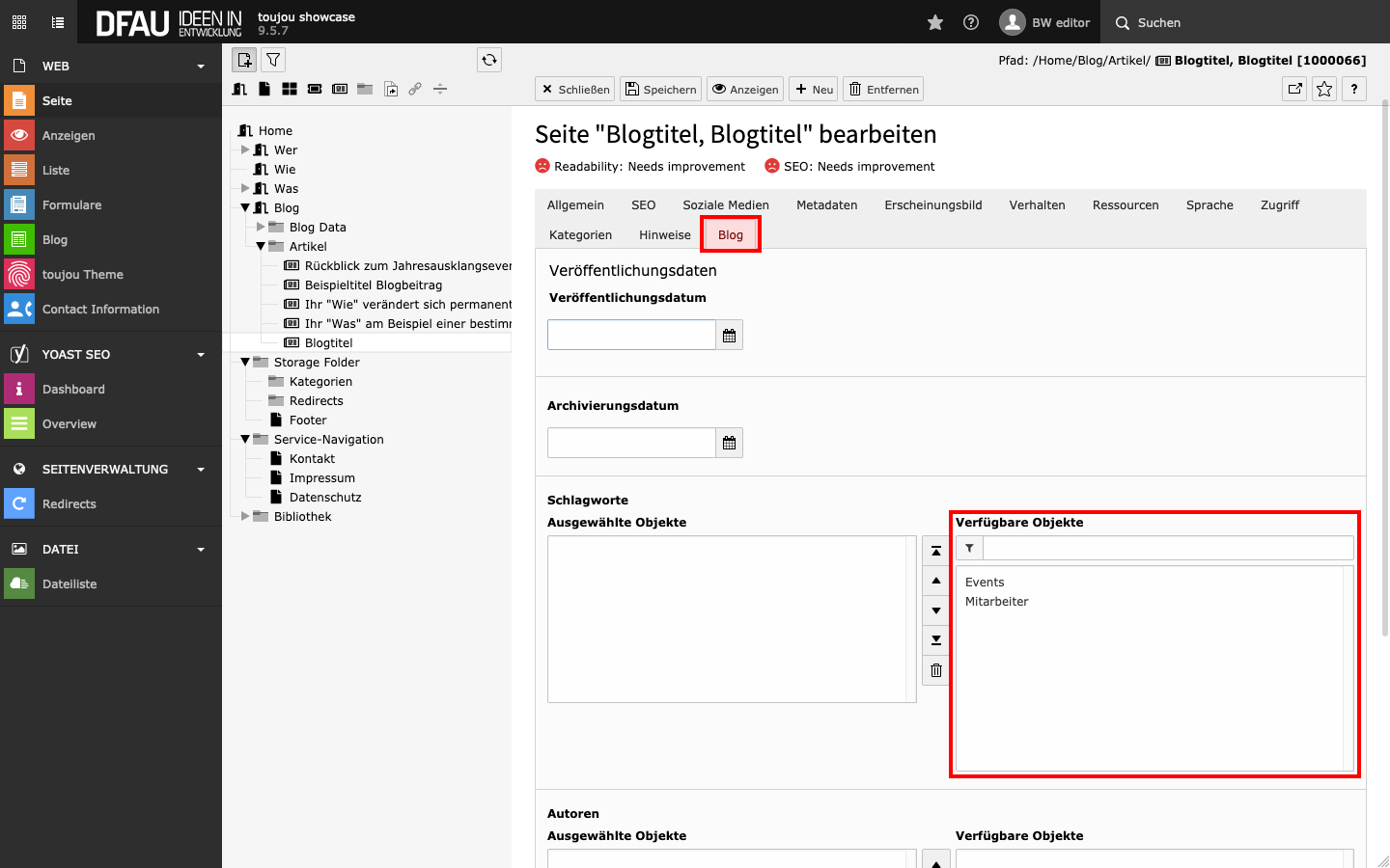- In den untenstehenden Schritten erfahren Sie, welche Reiter für Blog-Artikel relevant und zu bearbeiten sind.