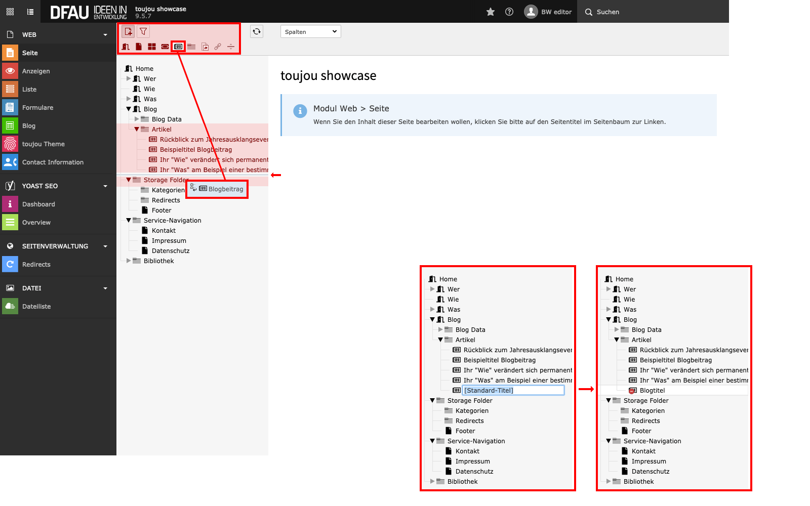 toujou bietet Ihnen von Haus aus die Möglichkeit, Blog-Einträge und Artikel in Form von News zu verwalten und darzustellen. Dieses Setup ist Voraussetzung für die Verwendung der toujou-Blog-Elemente und nicht mit den dort anzuwendenden Einstellungen zu verwechseln.