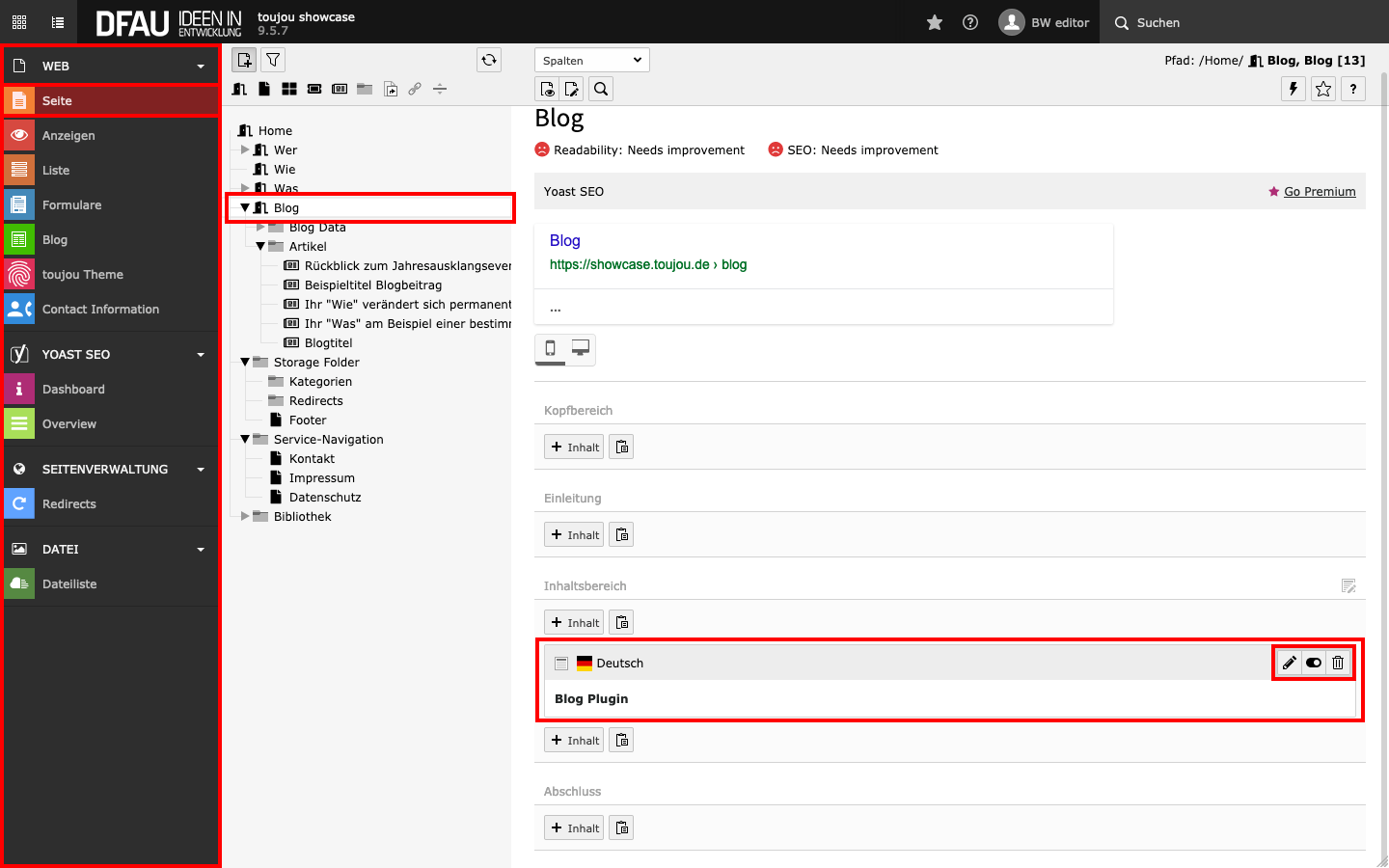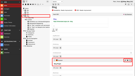 - Um eine Sidebar linksseitig Ihrer Blogposts anzulegen, klicken Sie oberhalb des bereits angelegten Plugins auf + Inhalt. Um eine Sidebar rechtsseitig Ihrer Blogposts anzulegen, klicken Sie unterhalb des bereits angelegten Plugins auf + Inhalt.
