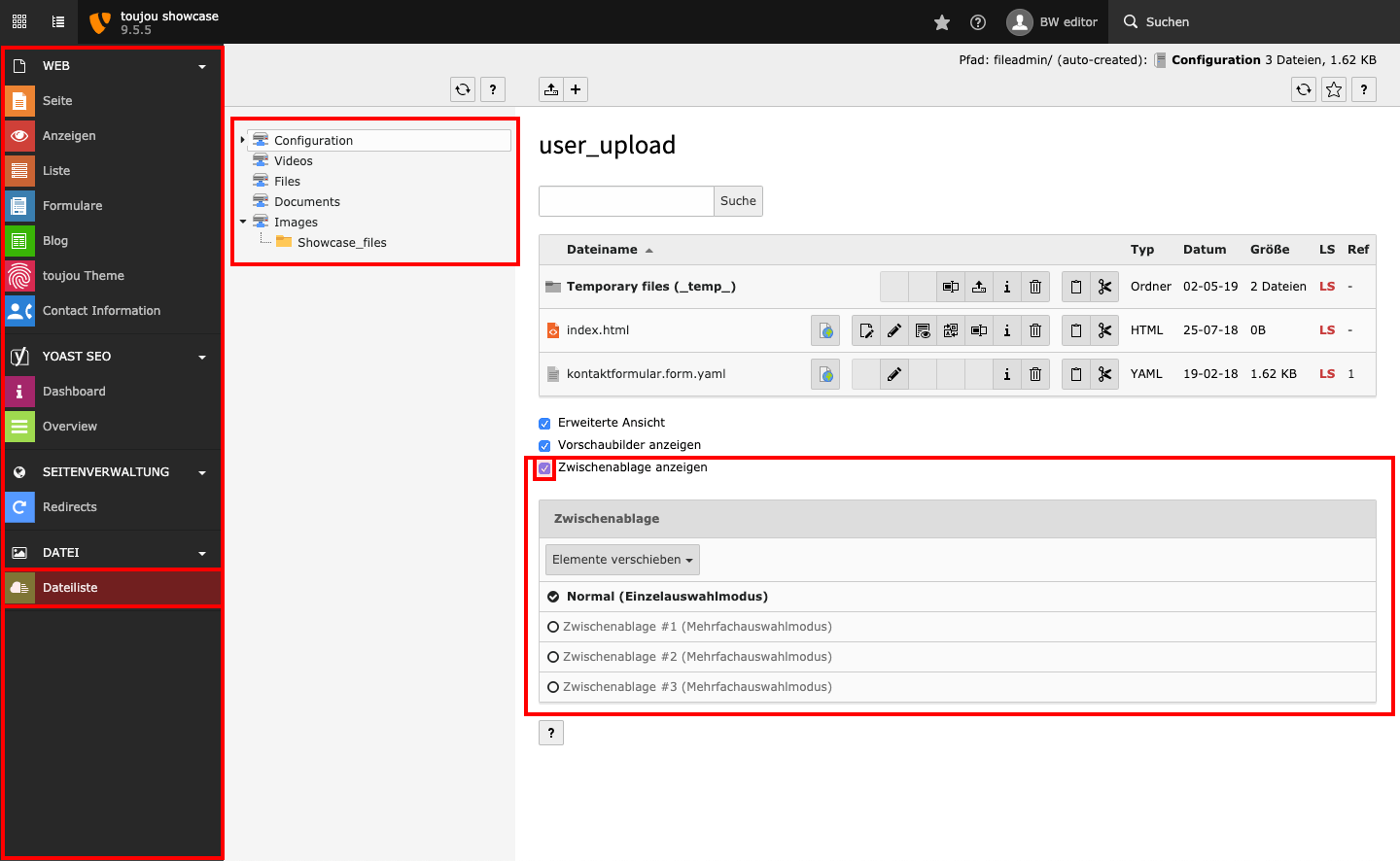 In toujou finden Sie nach TYPO3-Prinzipien hinterlegte Verzeichnisstrukturen vor, die Sie Ihren Bedürfnissen entsprechend anpassen und bestücken können. Hier erläutern wir Ihnen neben dem Umgang mit Bildern, Videos und Dateien das Hochladen und Bearbeiten Ihrer Files.