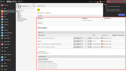 - Neben der Funktion für das Frontend der Website gibt es im toujou Backend auch ein Suchfeld für alle TYPO3-Anwender*innen und -Redakteur*innen. So haben Sie alle Seiten Ihrer Website auf einen Blick, in denen das Wort erscheint.