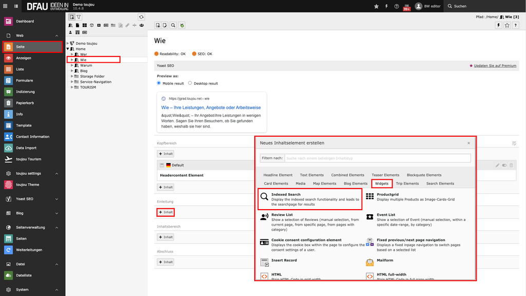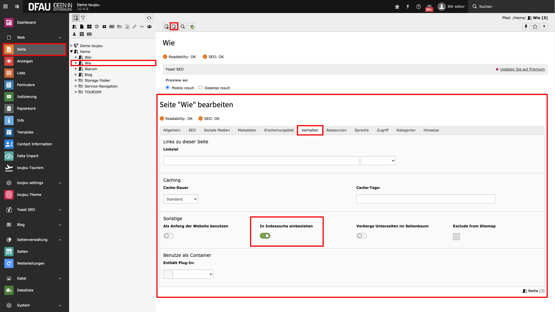- Damit eine Seite in der Suche berücksichtigt wird, muss sie indexiert sein. In toujou sind alle Seiten standardmäßig für die indexierte Suche freigeschalten.