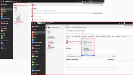 - Erstellen Sie eine Suchseite, indem Sie in der Auswahlleiste über Ihrem Seitenbaum eine Seitenart wählen und an die gewünschte Stelle per Drag and Drop ziehen. Benennen Sie die Seite, in unserem Beispiel Suchseite.