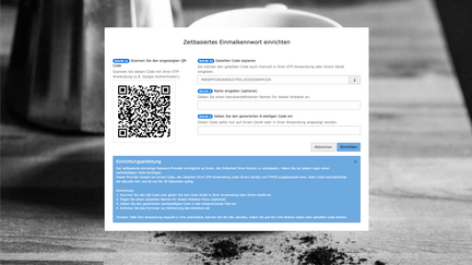- Scannen Sie zunächst mit der Authentifikator-App (OTP-Anwendung) auf Ihrem Smartphone den QR-Code. Sie erhalten in Ihrer App ein 6-stelliges Passwort. Alternativ können Sie den geteilten Code auch kopieren (Schritt 1b).