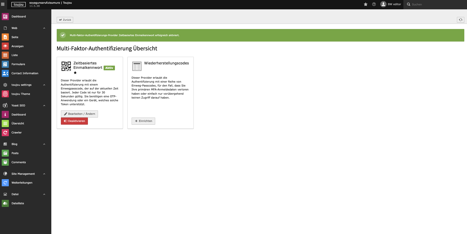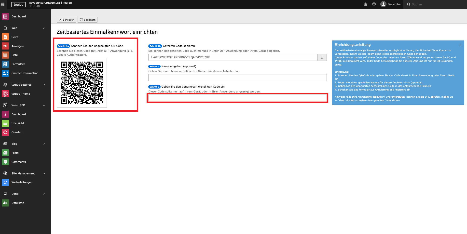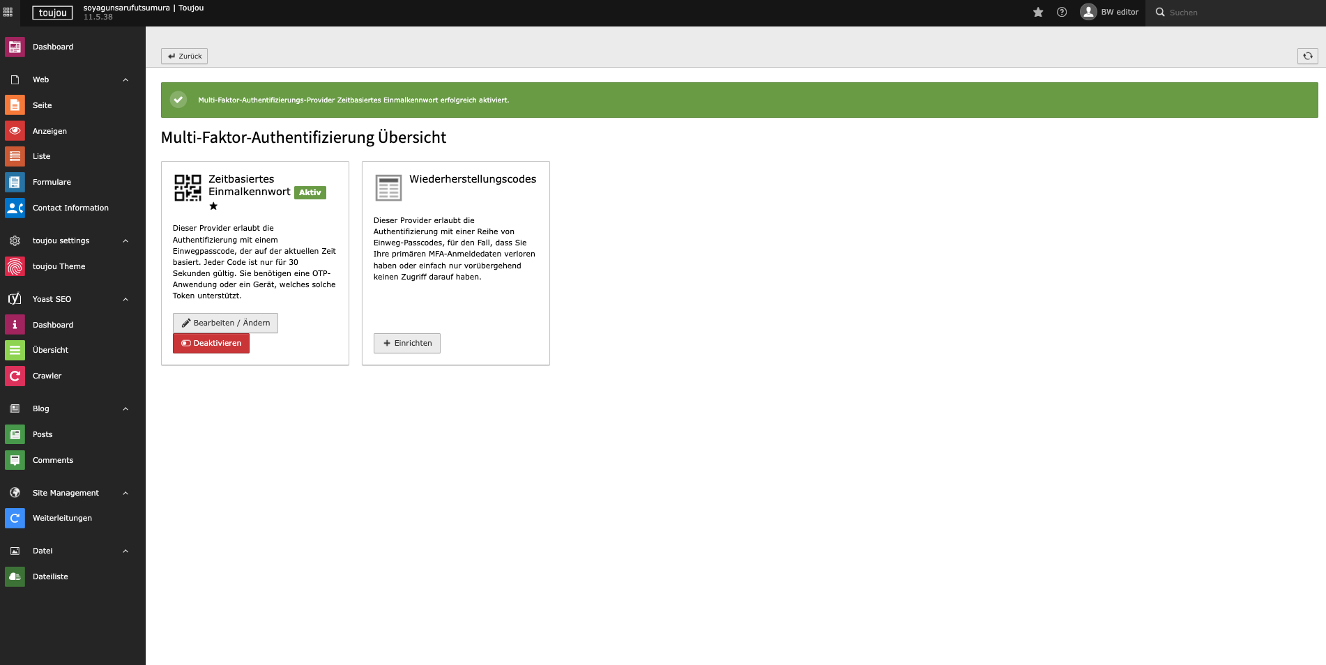 - Um sich ins toujou-Backend einzuloggen, erscheint nach Eingabe des Usernamens und des Passworts nun die Eingabemaske zur Multi-Faktor-Authentifizierung.
