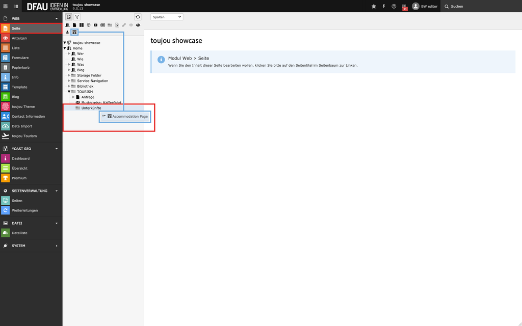 - Klicken Sie auf das Gebäude-Icon (»Accomodation Page«) und ziehen Sie es per Drag-and-Drop an die gewünschte Stelle innerhalb Ihres Seitenbaums.