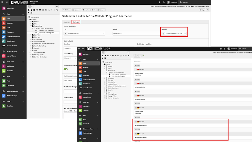 - Um mehrere Unterkünfte für verschiedene Saisons anzuzeigen, erstellen Sie die entsprechende Anzahl an Unterkunft-Elementen auf der Reiseseite im Bereich Unterkunft (analog zu Tripdescription). Jedes neue Element verknüpfen Sie mit der entsprechenden Saison unter dem Reiter Season. Im Screenshot sehen Sie die untereinander angeordneten Unterkünfte.
