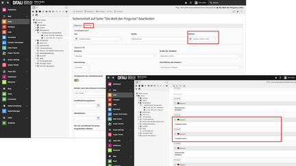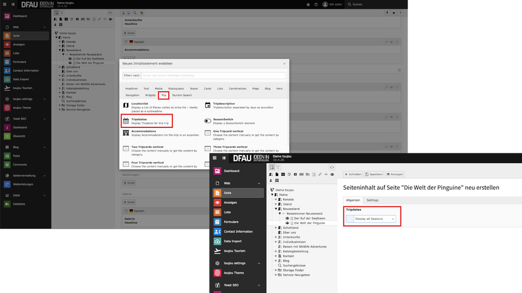 - Um eine zweite Reisebeschreibung auf der Reiseseite anzuzeigen, erstellen Sie eine weiteres Element Tripdescription im Seitenbereich »Reiseverlauf«, legen erneut die einzelnen Reisebeschreibungen an und wählen die gewünschte Saison aus dem Dropdown-Menü aus. Im rechten Screenshot sehen Sie die untereinander angeordneten Tripdescriptions.