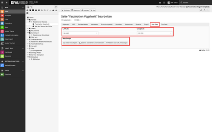 - Hier können Sie entweder den Standort mit Latitude (z.B. 47.4986653) und Longitude (z.B. 19.0703988) bestimmen oder unter Map Image mit Datei hinzufügen das statische Bild einer vorhandenen Karte einfügen.