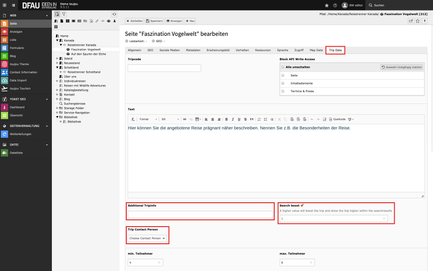 - Search Boost: Um die Ergebnisliste einer Reisesuche zu beeinflussen, können Sie Reisen einen Wert zuordnen (Standard: »1«). Je höher der von Ihnen eingetragene Wert, desto höher erscheit die Reise auf Suchergebnisseiten. Die numerische Skala legen Sie selbst fest, also zum Beispiel: 1 = normale Priorität bis 5 = höchste Priorität.