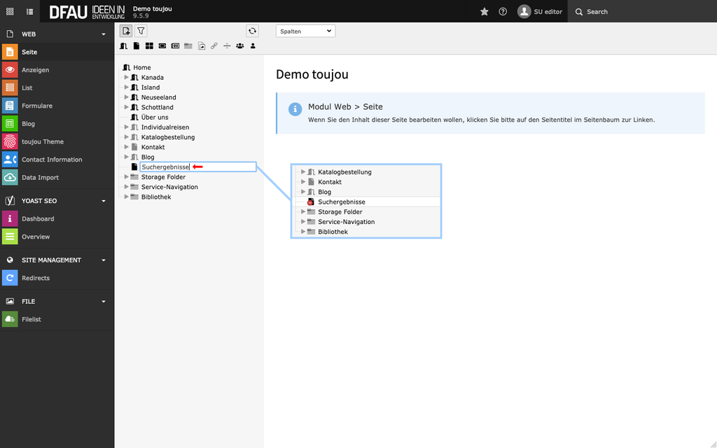 - Bleiben Sie im Seitenmodul und klicken im Seitenbaum auf die neu angelegte Seite.