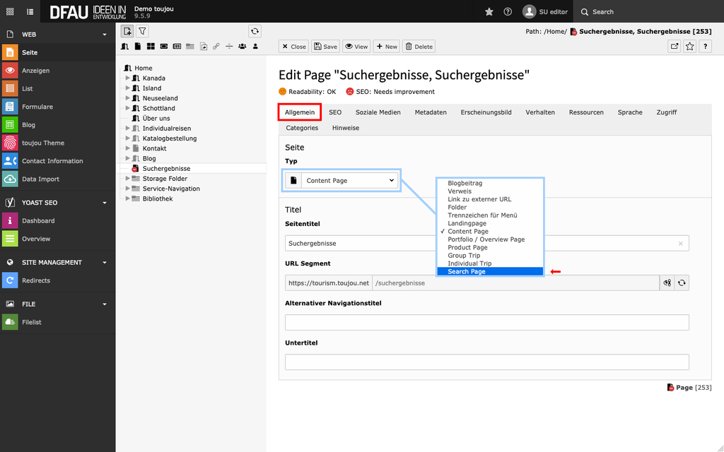 Hinweis: Eine Seite dieses Typs wird für neuere Installationen standardmäßig mitgeliefert. Für den (seltenen) Fall, dass mehrere Suchseiten für Ihre Ergebnisse genutzt werden bzw. auf Kundeninstallationen, die die Reisesuche noch nicht im System haben, müssen Suchseiten manuell nachgezogen werden.