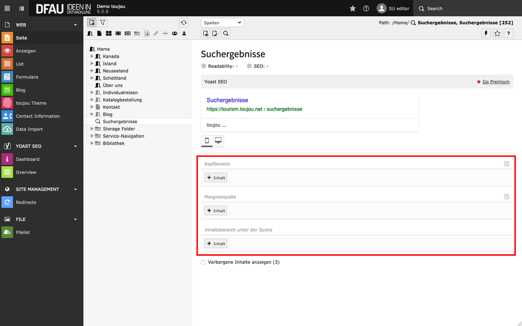 Auf der Template-Seite tourism.toujou.net sehen Sie die Suchfunktion im Einsatz. Im Screenshot unten sehen Sie die Aufteilung der Bereiche, die bei einer Suchseite automatisch ausgespielt werden (blau), sowie die Content-Bereiche, die Sie befüllen können (rot).