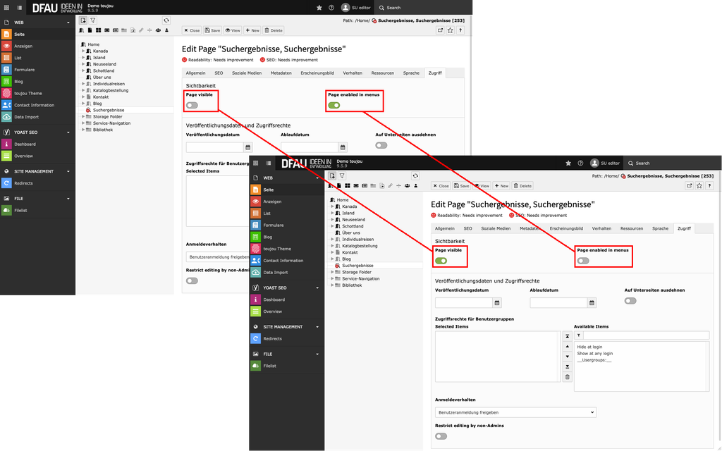 - Per Default werden neue Seiten in Ihrer Navigation angezeigt. Im Falle der Suchseite – diese soll schließlich nur nach Festlegung von Suchkriterien angezeigt werden – deaktivieren Sie die Sichtbarkeit im Bereich Page enabled in menus mittels Schalter.