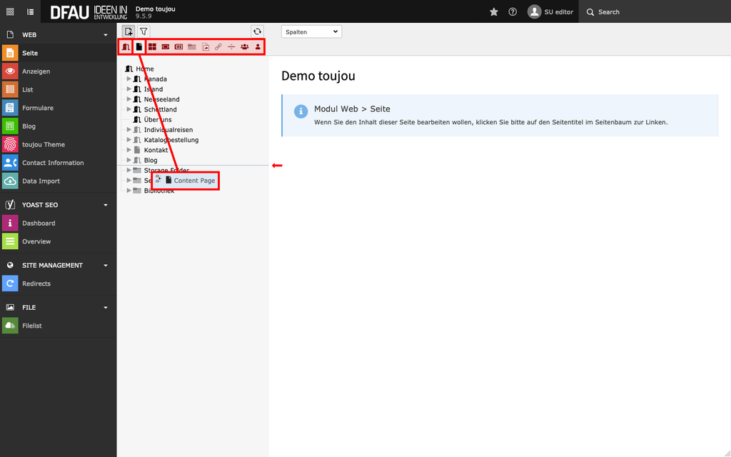 - Oberhalb des Seitenbaums sehen Sie die verfügbaren Seiten-Icons.
