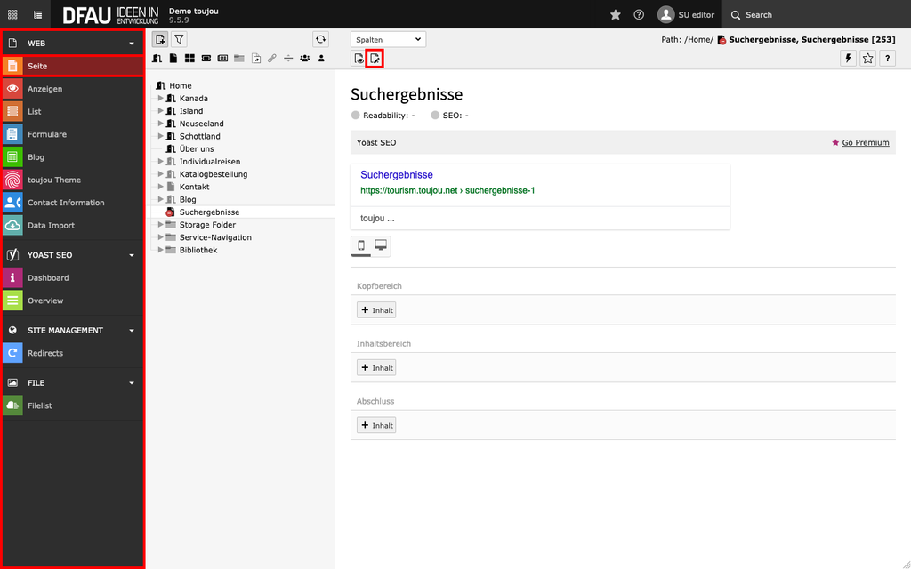 - Zur Gestaltung der Seite stehen Ihnen, anders als bei »regulären« Inhaltsseiten, eingeschränkte Arbeitsbereiche für Content-Elemente zur Verfügung: ein Kopfbereich, eine Marginalspalte rechts der Suchergebnisse und ein Inhaltsbereich unter der Suche.