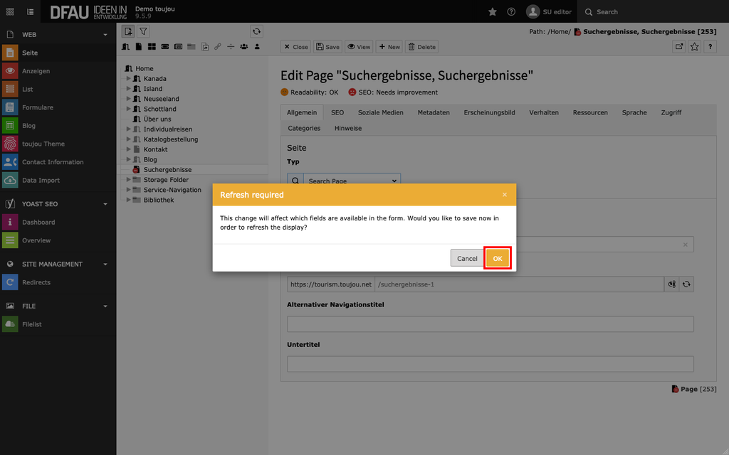 - Da die oben beschriebene Veränderung des Seitentyps für bestehende Seiten Folgen für deren Funktionalität und Inhalte hat, müssen Sie diese Bearbeitung gesondert bestätigen.