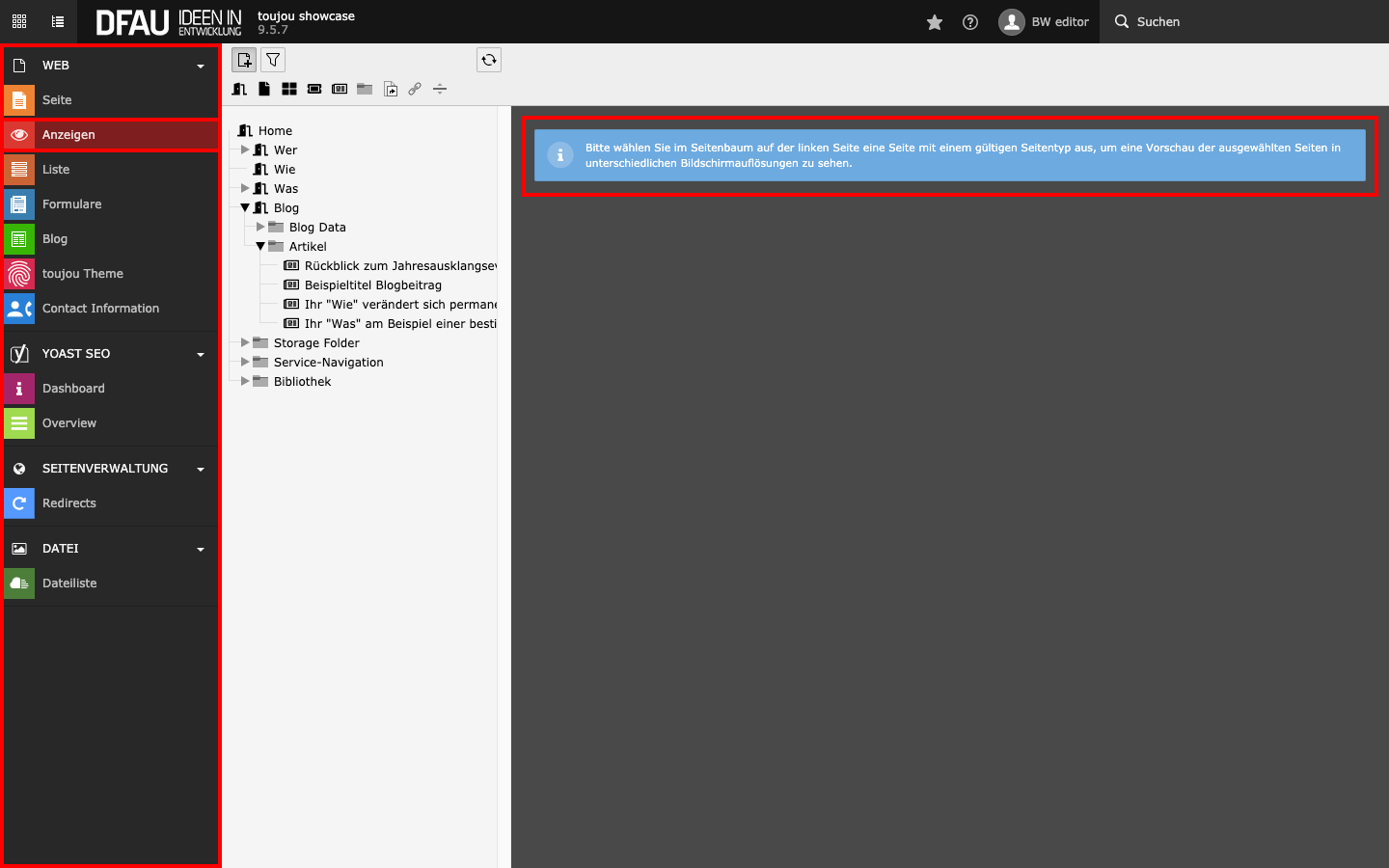 In toujou können Sie Ihre Seiten vor Veröffentlichung oder bei der Bearbeitung überprüfen, wie Sie es von TYPO3 gewohnt sind. Wir erklären Ihnen den Umgang mit dem Anzeigen-Modul und erläutern, wie Sie die Performance Ihrer Website prüfen und gegebenenfalls optimieren können.