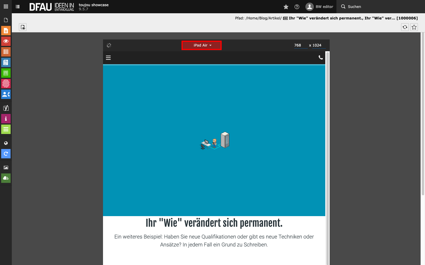 Links in der Menüleiste des Backends finden Sie das rote Icon Anzeigen/View. Mit einem Klick darauf können Sie Ihre Arbeit auf jeder Unterseite direkt in verschiedenen Größen überprüfen.