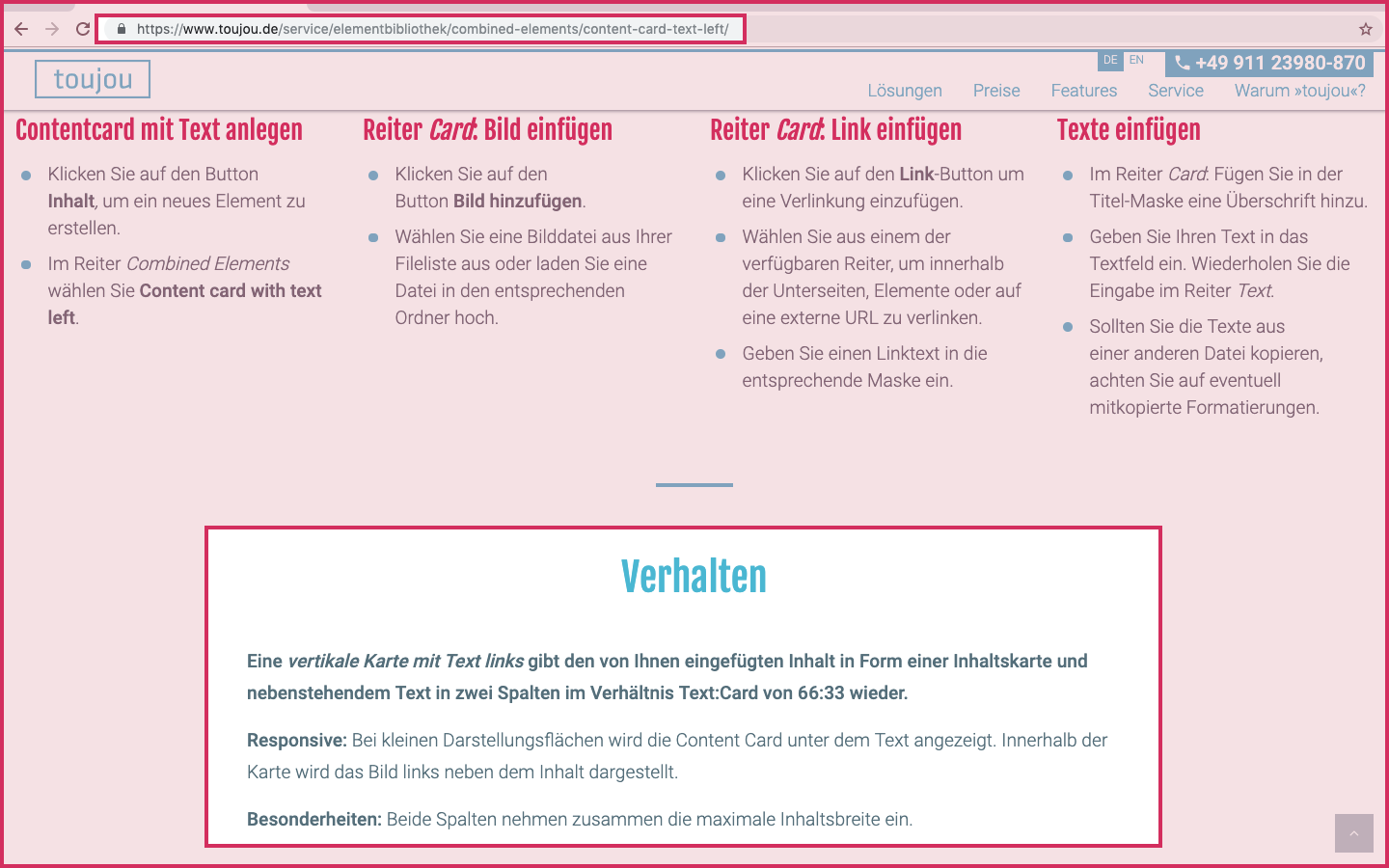 In den jeweiligen Verhaltensbeschreibungen (Beispiel: Content Card with Text left) einzelner Elemente können Sie das Verhalten von Bild zu Text oder von Text zu Text mit mehr als zwei Blöcken, Teaserkarten, Landkarten und so weiter nachlesen, ehe Sie sich für den Einsatz eines bestimmten Elements entscheiden.