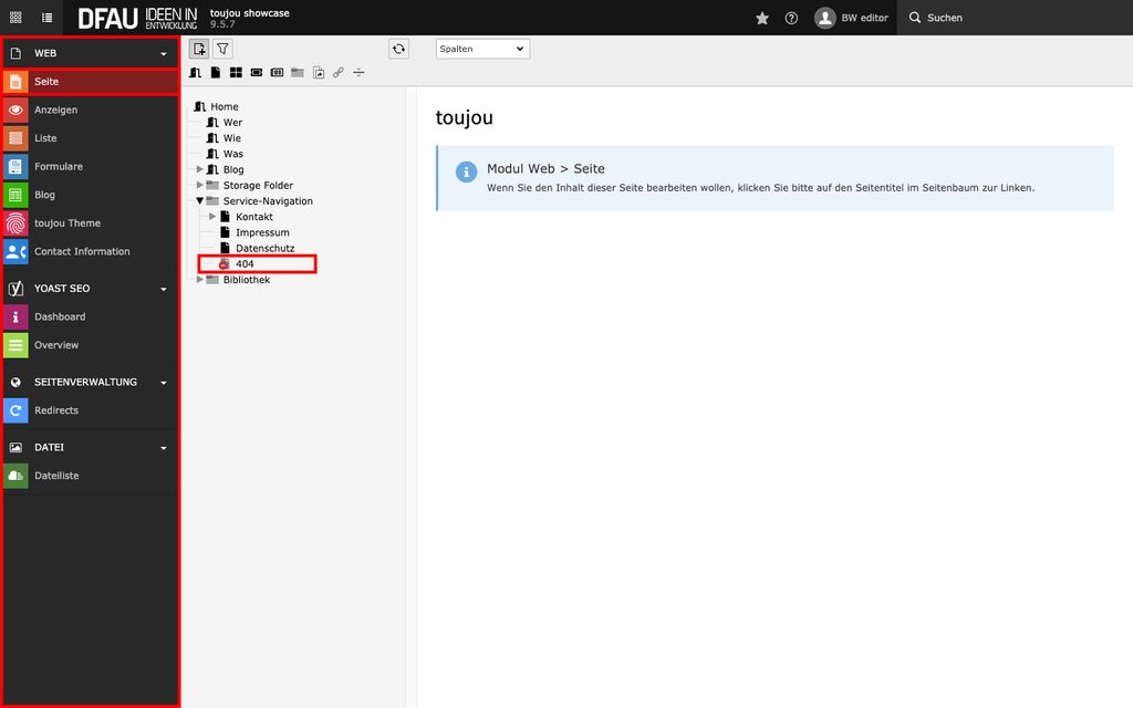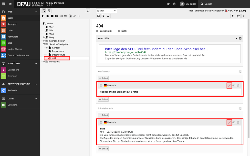 Unterseiten mit dieser Information weisen darauf hin, dass die gesuchte Seite nicht (mehr) existiert. Jede toujou-Website verfügt von Haus über eine Fehlerseite »404«, die bei Installation jedoch ausgeblendet ist. Es handelt sich um eine Inhaltsseite mit einer festgelegten Page-ID, auf die Besucher*innen Ihrer Website per Default umgeleitet werden. WICHTIG: Diese Seite sollte nicht gelöscht werden!
