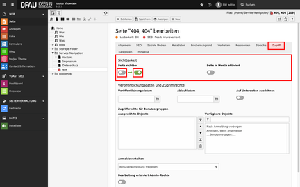 - Wählen Sie den Reiter Zugriff und stellen den »Schalter« im Bereich Seite sichtbar auf Grün.