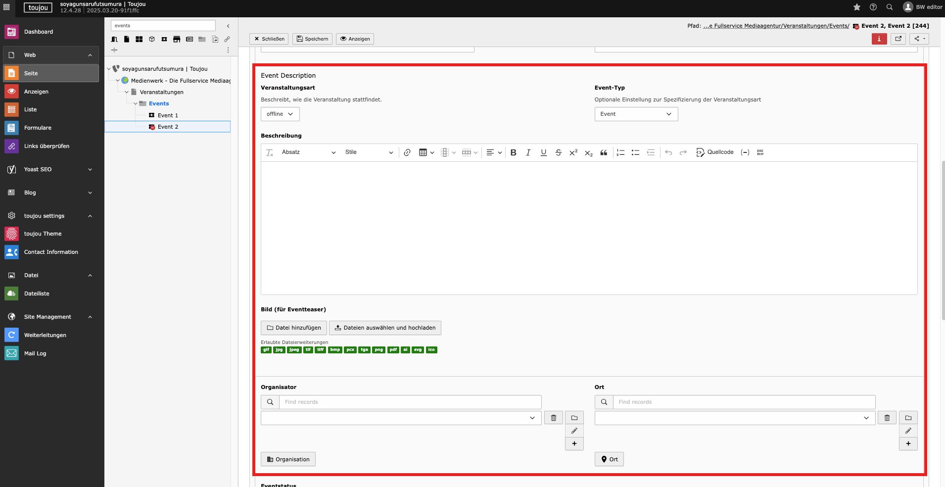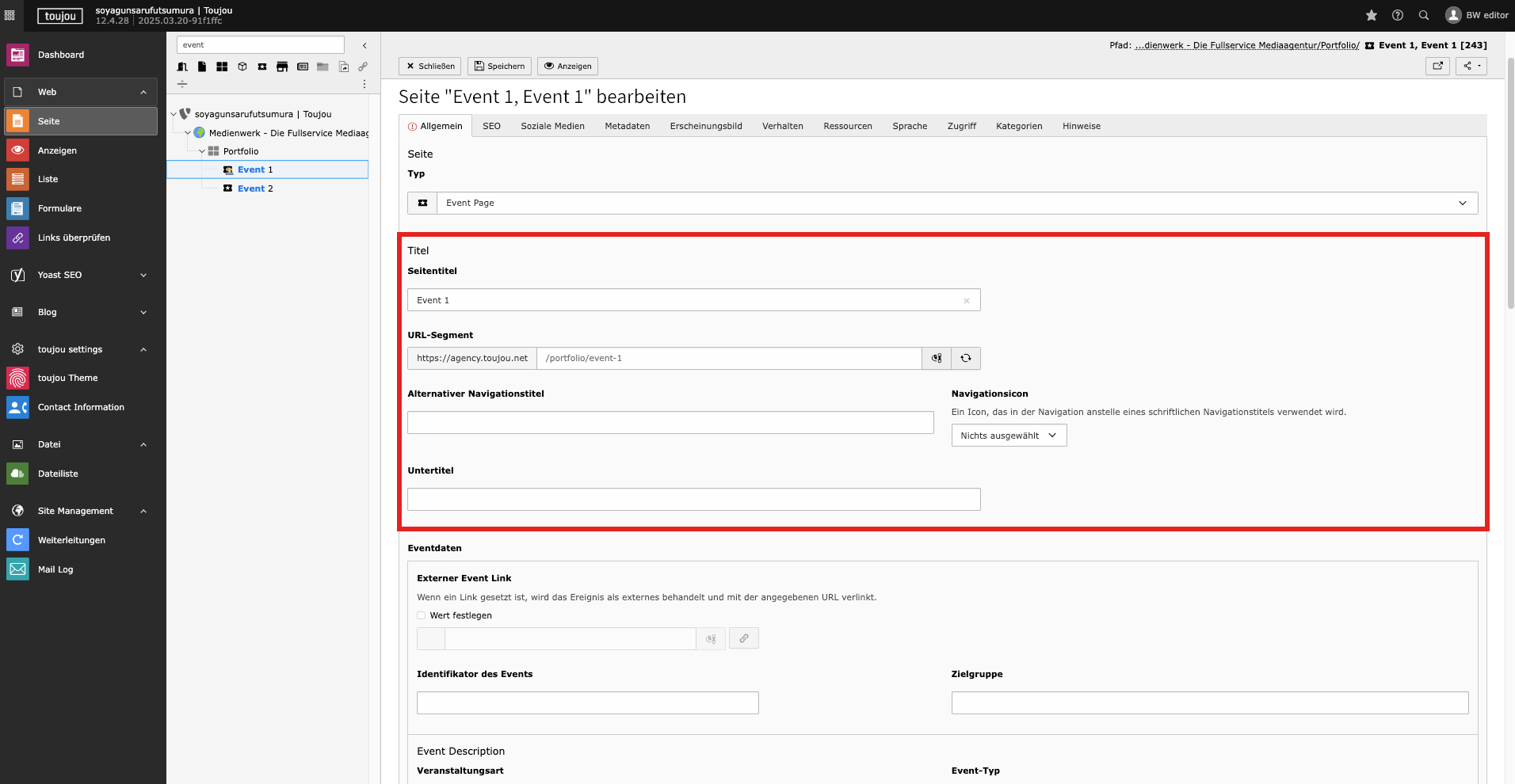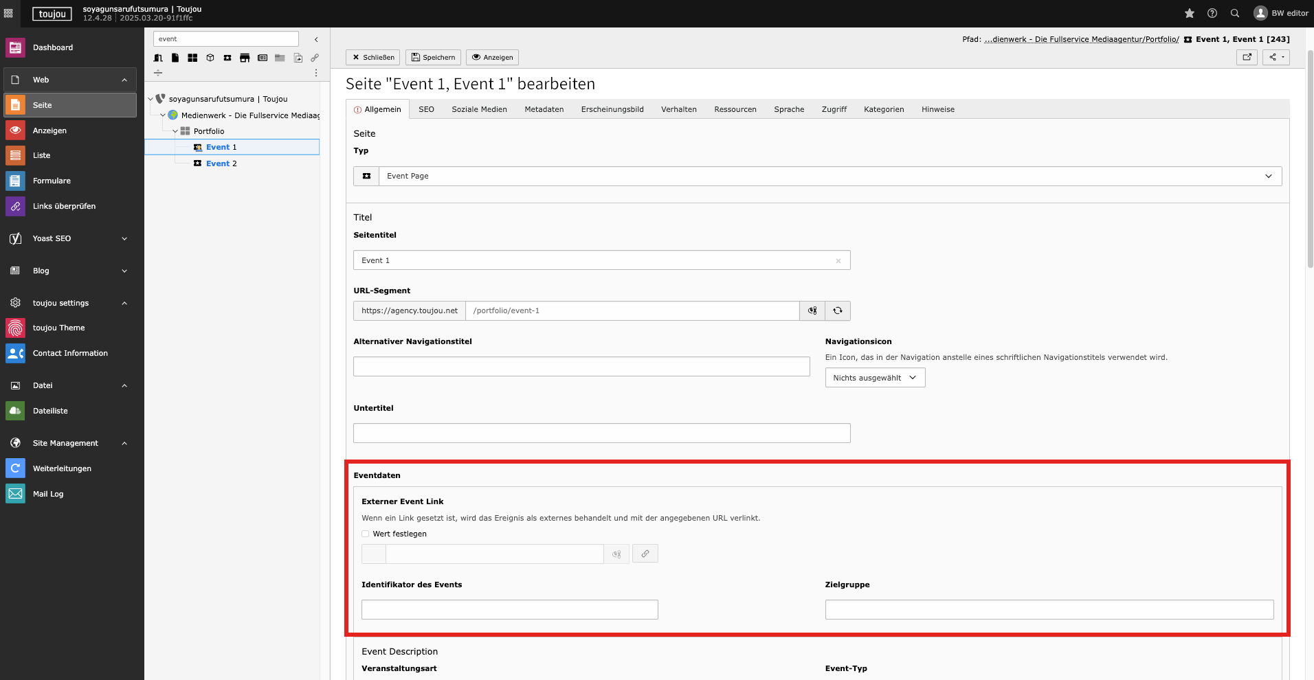 Eine Eventseite verhält sich wie eine Contentseite, auf der Sie die toujou-Elemente anlegen und die Seiteneigenschaften wie SEO oder Indexsuche bearbeiten. Die im Reiter Event Data eingetragenen Informationen werden auf einer Eventseite nur dann angezeigt, wenn diese auch mit Contentelementen befüllt ist.
