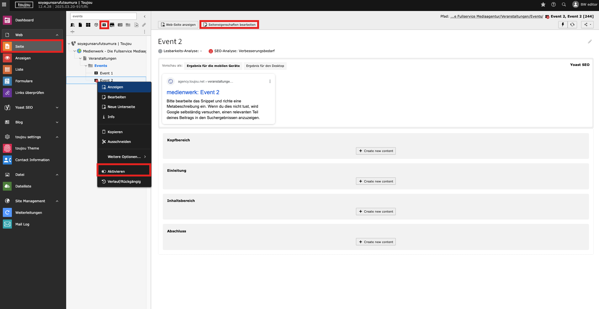- Zur Aktivierung der Seite im Frontend wählen Sie per rechten Mausklick die Seite – in diesem Beispiel Event 2– an. Es öffnet sich ein Auswahlfenster. Klicken Sie auf den Button Aktivieren.