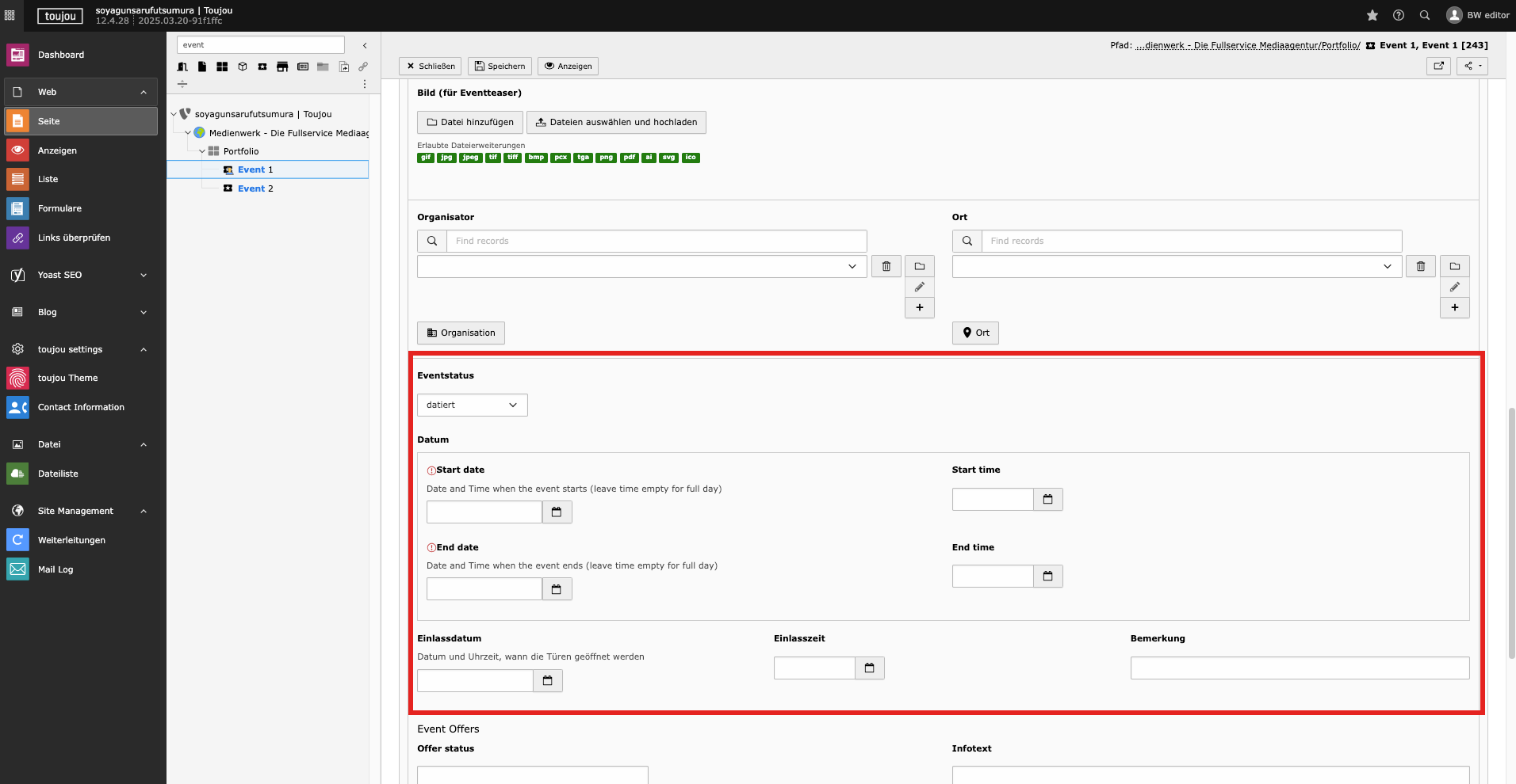- Im Bereich Event-Status haben Sie die Möglichkeit, Datum und Status zu definieren. Ohne eingetragene Event-Daten kann eine Event-Seite nicht abgespeichert werden.