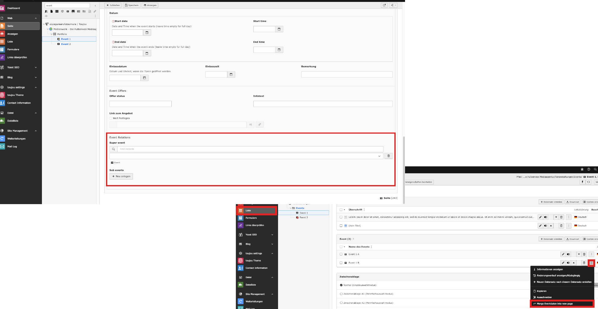- Anmerkung: Beim Anlegen solcher Sub-Events werden diese als reine Datensätze erstellt. Um ein Sub-Event mit eigener URL zu versehen, klicken Sie auf das Listenmodul und das übergeordnete Event. Es erscheint das Sub-Event in der Ansicht. Klicken Sie auf das Icon mit den drei Punkten und anschließend auf die Option Merge Eventdaten into new page.