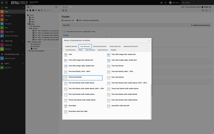 Wie oben beschrieben, sind Sie auch in der inhaltlichen Gestaltung Ihres manuellen Footers frei. Bei Nutzung eines manuellen Footers sind Sie in toujou nicht auf ein einziges Inhaltselement beschränkt. Entsprechend legen wir unterhalb des Elements Three text blocks nun ein zweites Beispiel-Element, Text, an.