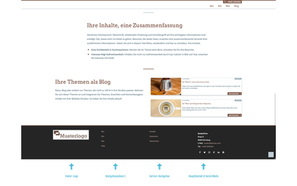Die hier automatisch verlinkten Navigationspunkte entsprechen denen der Kopfzeile Ihrer Website. Verändern Sie die erste Navigationsebene Ihrer Website, so verändern Sie auch die im Footer ausgespielten Links.