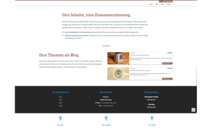 Die Notwendigkeit eines manuellen Footers richtet sich ein Stück weit nach Ihrem Geschäftsfeld. Unser Beispiel mit der Nennung von Öffnungszeiten ist für den Einzelhandel und Betriebe mit geregelten Geschäftszeiten nützlich. Andere Websites stellen im Footer mehr Unterseiten und Navigationsebenen dar, ermöglichen Newsletter-Anmeldungen, verlinken Partner-Logos und so weiter. Es gilt wie so oft der Tipp: Schauen Sie sich unter toujou-Kunden, im Web und/oder bei der Konkurrenz um und entscheiden.