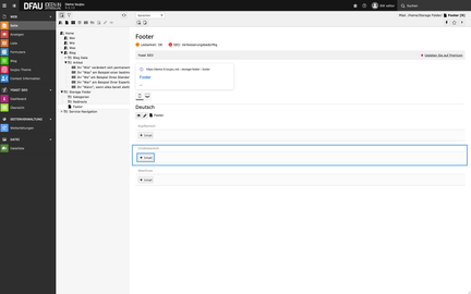 Im Seitenbaum Ihrer Website befindet sich ein Ordner »Service-Navigation«, der aus den Unterseiten Kontakt, Impressum und Datenschutz besteht. Veränderungen, die Sie in dem Ordner vornehmen, wirken sich auf die Links im Footer aus.