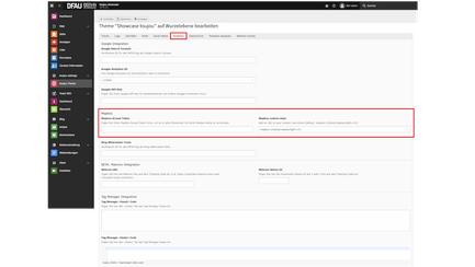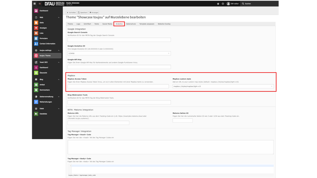 - Um den Zugangstoken für Ihre Website einzugeben, klicken Sie in der Modulleiste auf toujou Theme und anschließend auf den Reiter Analytics.