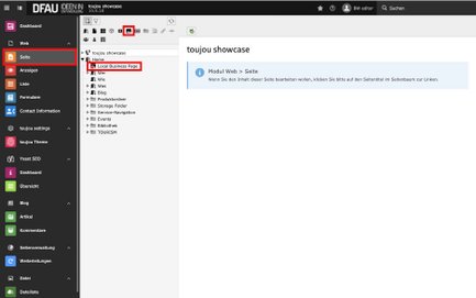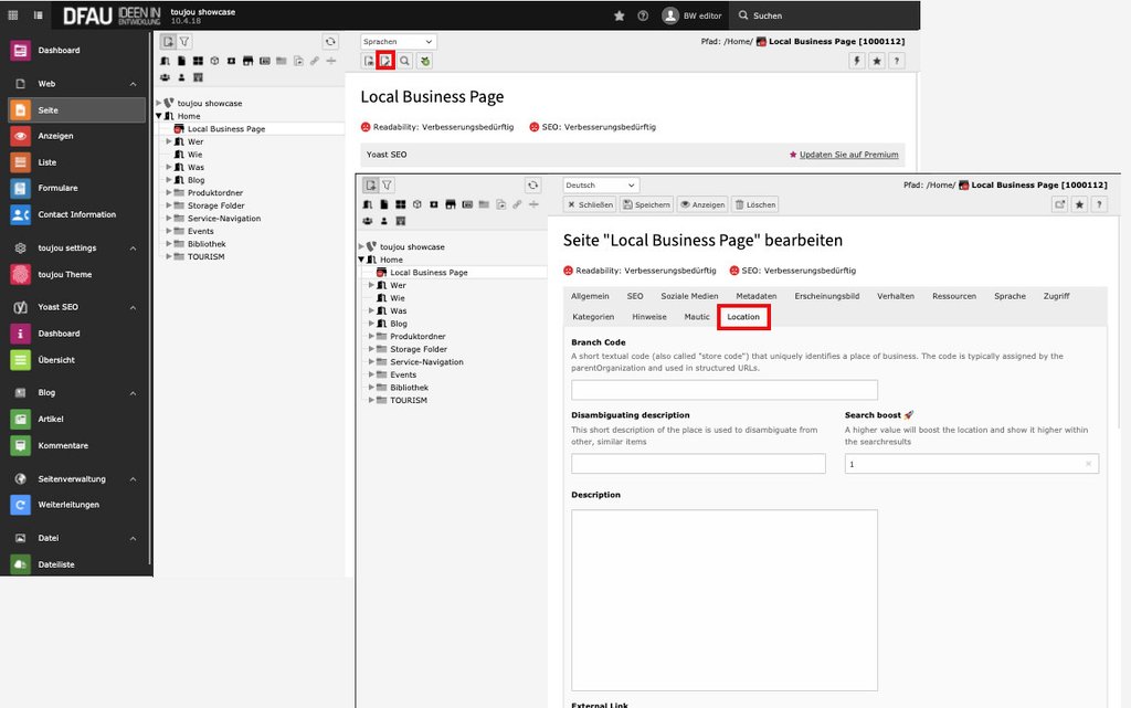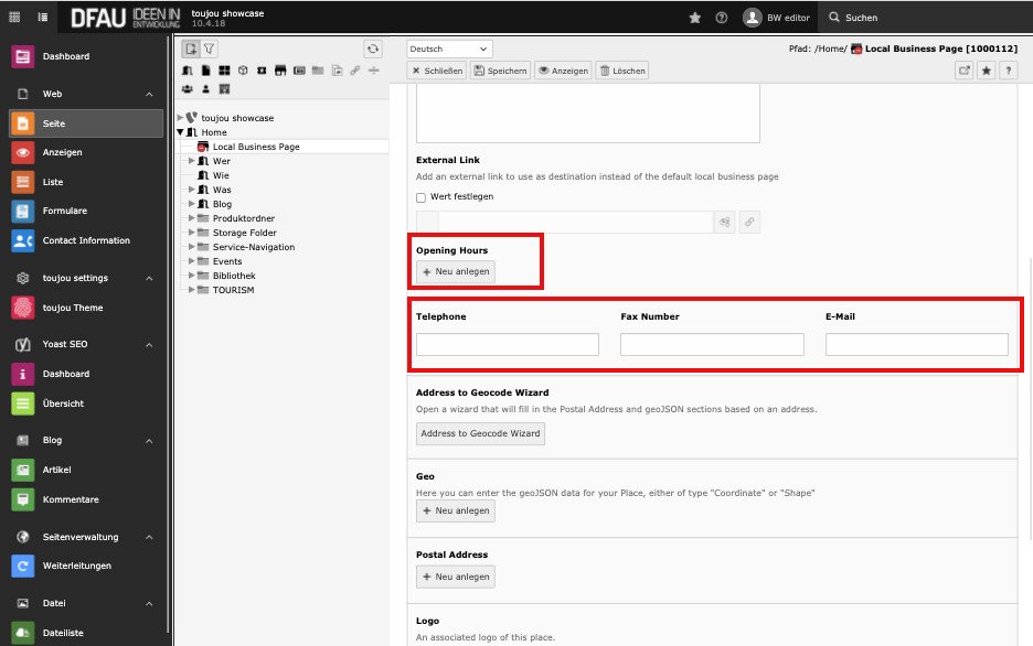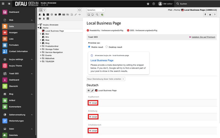 - Die Local Business Page verhält sich wie eine Contentseite, auf der Sie die toujou-Elemente anlegen und die Seiteneigenschaften wie SEO oder Indexsuche bearbeiten können. Die im Reiter Location eingetragenen Informationen werden jederzeit auf der Seite angezeigt. Optional haben Sie zudem noch die Möglichkeit, die Seite mit Content zu befüllen.