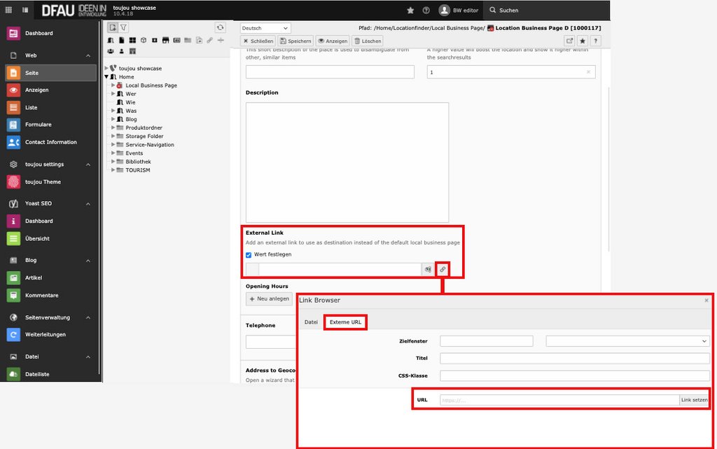 In toujou können Sie für Ihre Website eigene Standorte auf einer Karte anzeigen lassen. Dafür erstellen Sie im TYPO3-Backend eine Local Business Page und fügen die gewünschten Informationen ein. Alle erstellten Local Business Pages können mittels Location Finder ausgespielt werden. In diesem Tutorial erläutern wir die einzelnen Schritte vom Erstellen der Seite über das Hinzufügen der relevanten Informationen.
