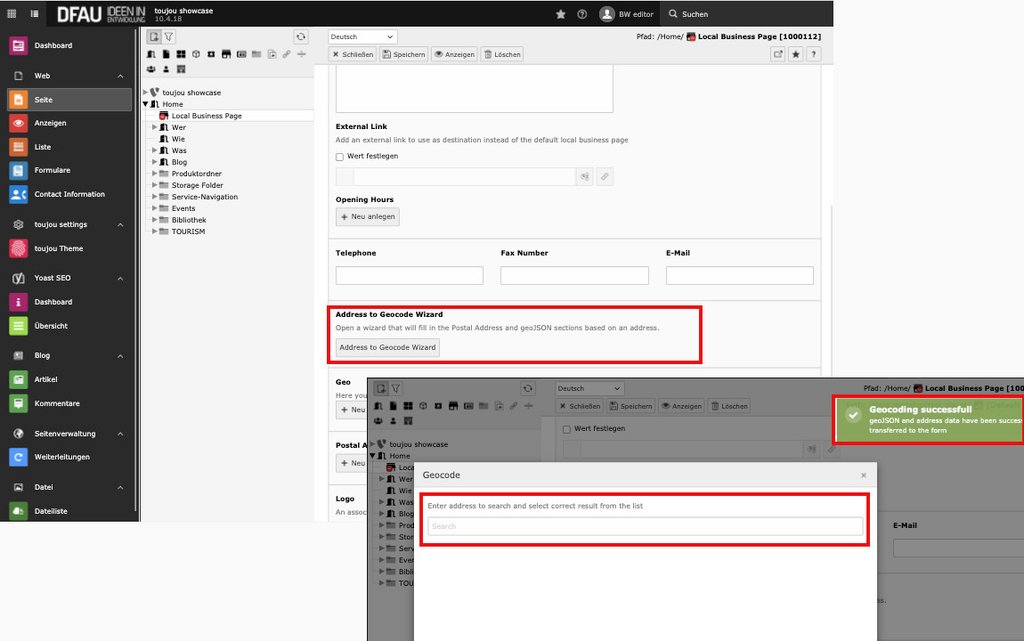 - Ist die Dateneingabe erfolgreich, erscheint ein grünes Kästchen am oberen rechten Rand mit der Bestätigung. Eine zusätzliche Möglichkeit zum Überprüfen besteht im Bereich Geo (direkt unter dem Geocode Wizard). Dort erscheint automatisch nach der Eingabe der Geocode.