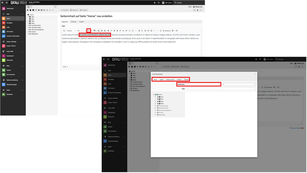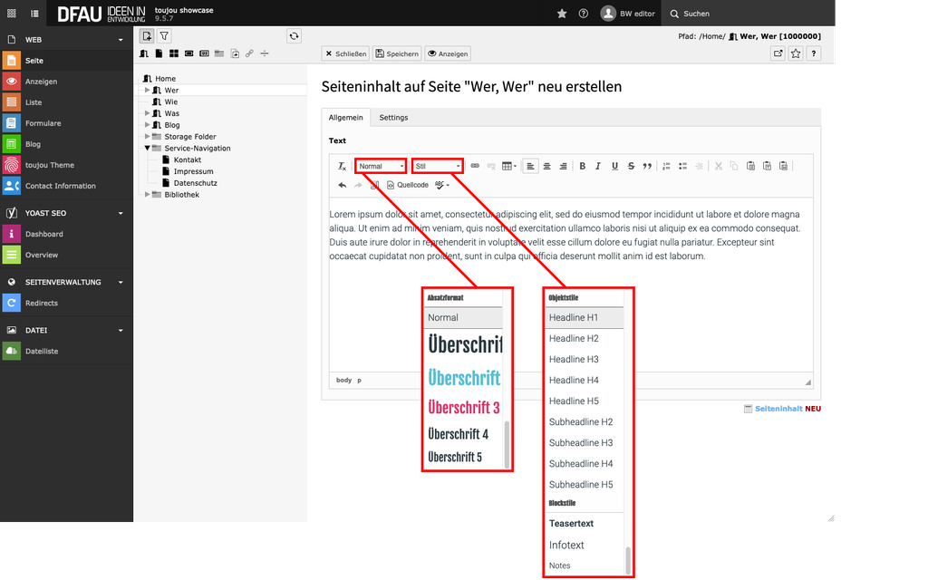Die Arbeit mit Richtext Editor (RTE) in toujou bzw. TYPO3 unterscheidet sich in ihrer Logik nur geringfügig von der Arbeit mit Textverarbeitungsprogrammen gängiger Betriebssysteme. Seien Sie flexibel darin, mit den Möglichkeiten zu experimentieren und – vor allen Dingen – achten Sie beim Kopieren/Einfügen von Texten auf formatierte Inhalte. Diese müssen gegebenenfalls gelöscht oder von Grund auf neu formatiert werden, um sich im Frontend so darzustellen, wie Sie es wünschen.
