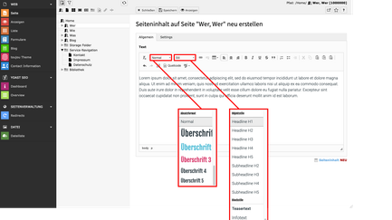 - In toujou haben Sie im Texteditor die Möglichkeit, über das Menü Absatzformat (kurz: Format) Text(teil)e als Überschrift H1 bis H5 auszuzeichnen oder